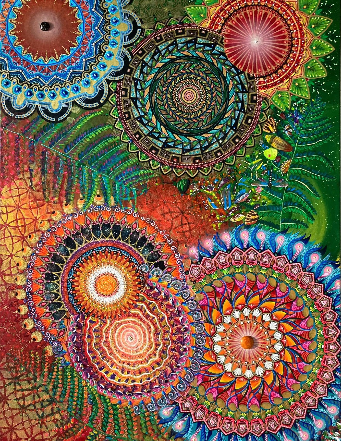 Akryl, swarovski kryštáliky, sklenené korálky, drahé kamienky, kabošony a farebné kryštáliky na plátne na drevenom ráme