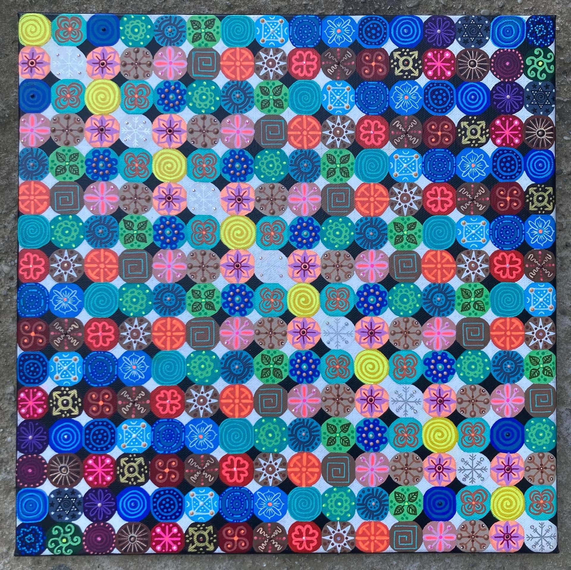 Joy je tanec farieb a tvarov. Na prvý pohľad presný, geometrický – no srdcom divoký a hravý. Pestrofarebný ornamentálny vzor pulzuje životom. Každé políčko je ako malý kúsok skladačky – zdobený drobnými kryštálikmi, ornamentami a farebnou hrou, ktorá spolu vytvára mozaiku radosti, mierne hypnotickú a hravú. Pôvodne mal byť ilúziou, klamom pre oči – no nakoniec sa stal pravdou pre srdce.