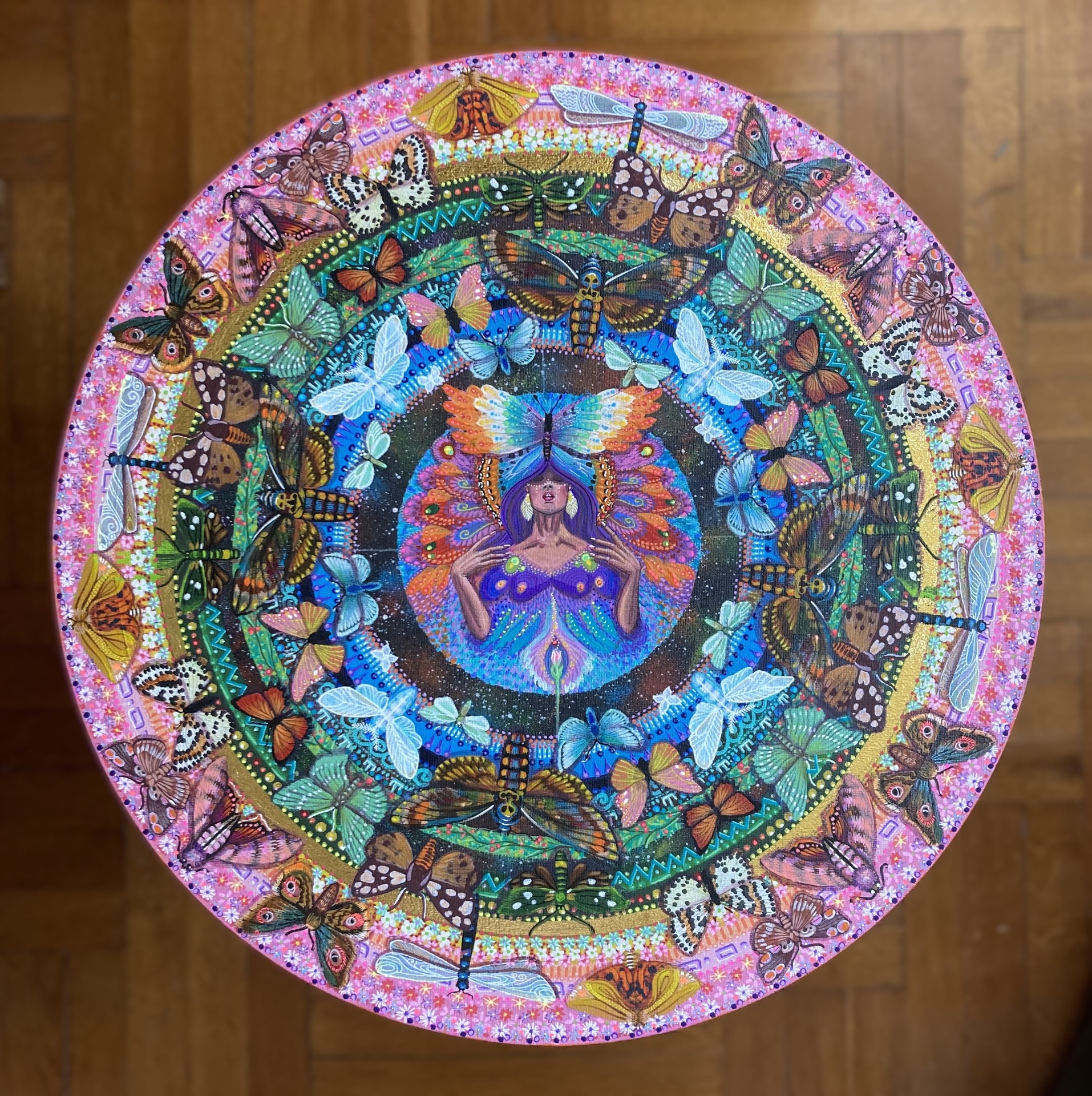 mandala žiariaca energiou transformácie a duchovného vzostupu. Centrom je symbol božskej múdrosti, ženskej sily a vnútornej harmónie. Motýle a vážky prinášajú posolstvo slobody, neustálej premeny a ľahkosti bytia.