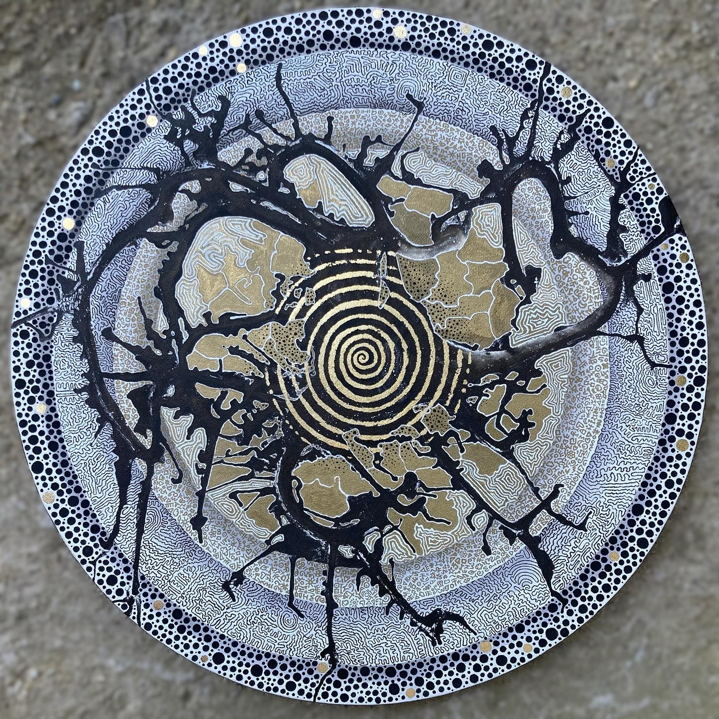Každý detail ornamentov, čierno-biele kruhy a zlaté plátky odrážajú jemný balans svetla a tmy, poriadku a chaosu. Energia, ktorá prerastá cez hranice formy – dravá a nevyspytateľná, no zároveň nevyhnutná a neoddeliteľná od celku.