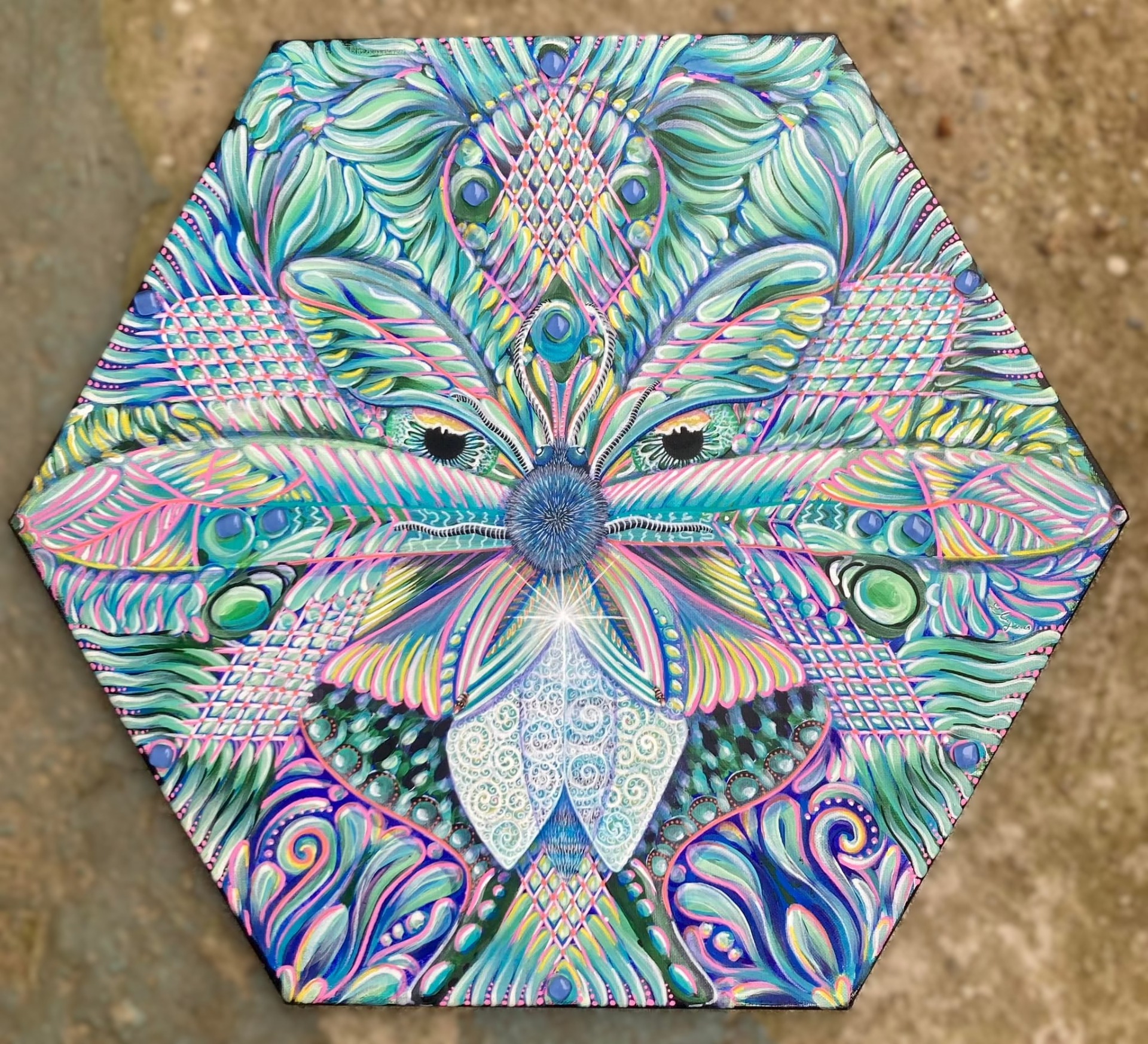 Akryl a moazikové kamienky na šesťuholníkovom plátne