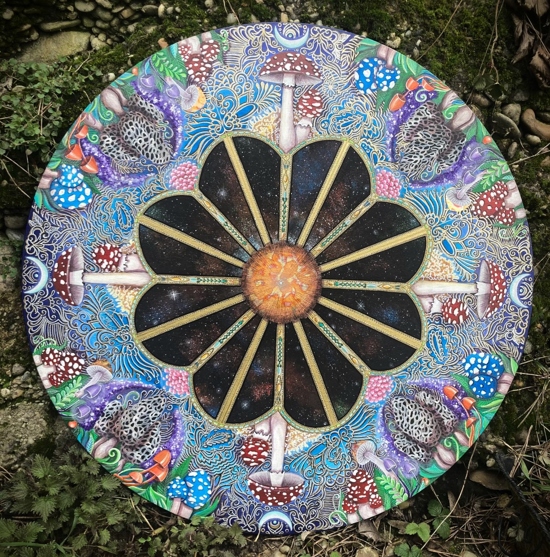 Je to brána kdesi medzi snovou krajinou, prírodnou múdrosťou a vesmírnym tichom. Huby, prastaré spojenie medzi svetom hore a dolu, tu vyrastajú priamo z hviezdneho prachu. Sú symbolom tichej múdrosti, skrytých ciest a nevypovedaných správ. Ich tanec vytvára portál — obraz, ktorý je zároveň bránou, mandalou aj snom. Ich farby sú nádherné a žiarivé a nesú v sebe rovnováhu života a smrti, krásy a varovania. Tvária sa nehybne a nenápadne, ich podzemné siete sa však tiahnu a prepletajú hlboko. Spájajú svet pod nohami s tými najvzdialenejšími zákutiami prírody.